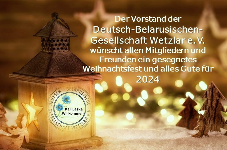 Mitgliederversammlung 2020 Die Mitgliederversammlung der Deutsch-Weißrussischen Gesellschaft Wetzlar findet in diesem Jahr am Dienstag, den 04.08.2020, um 19.00 Uhr (35625 Hüttenberg, Tannenhof) statt. Neben den Rechenschaftsberichten stehen auch Wahlen auf der Tagesordnung. Alle Mitglieder sind herzlich willkommen.